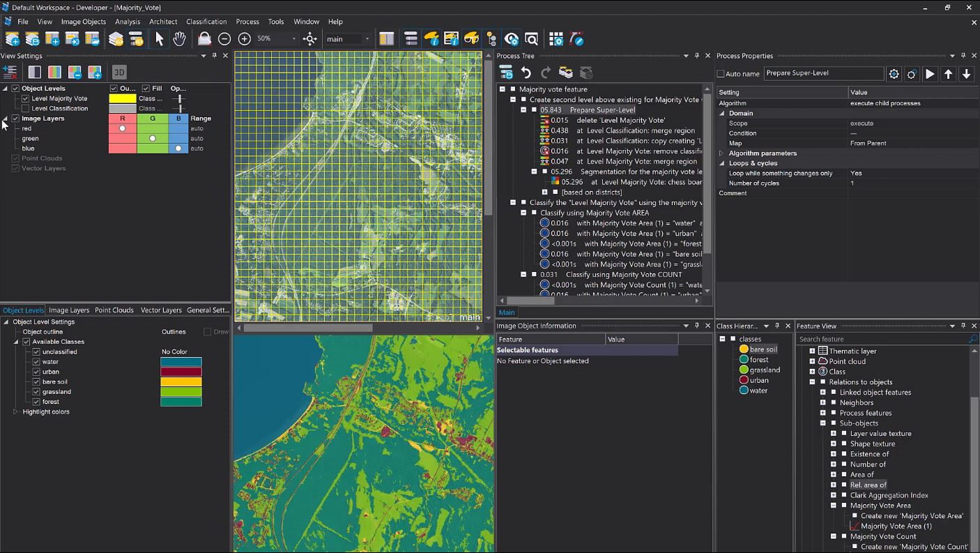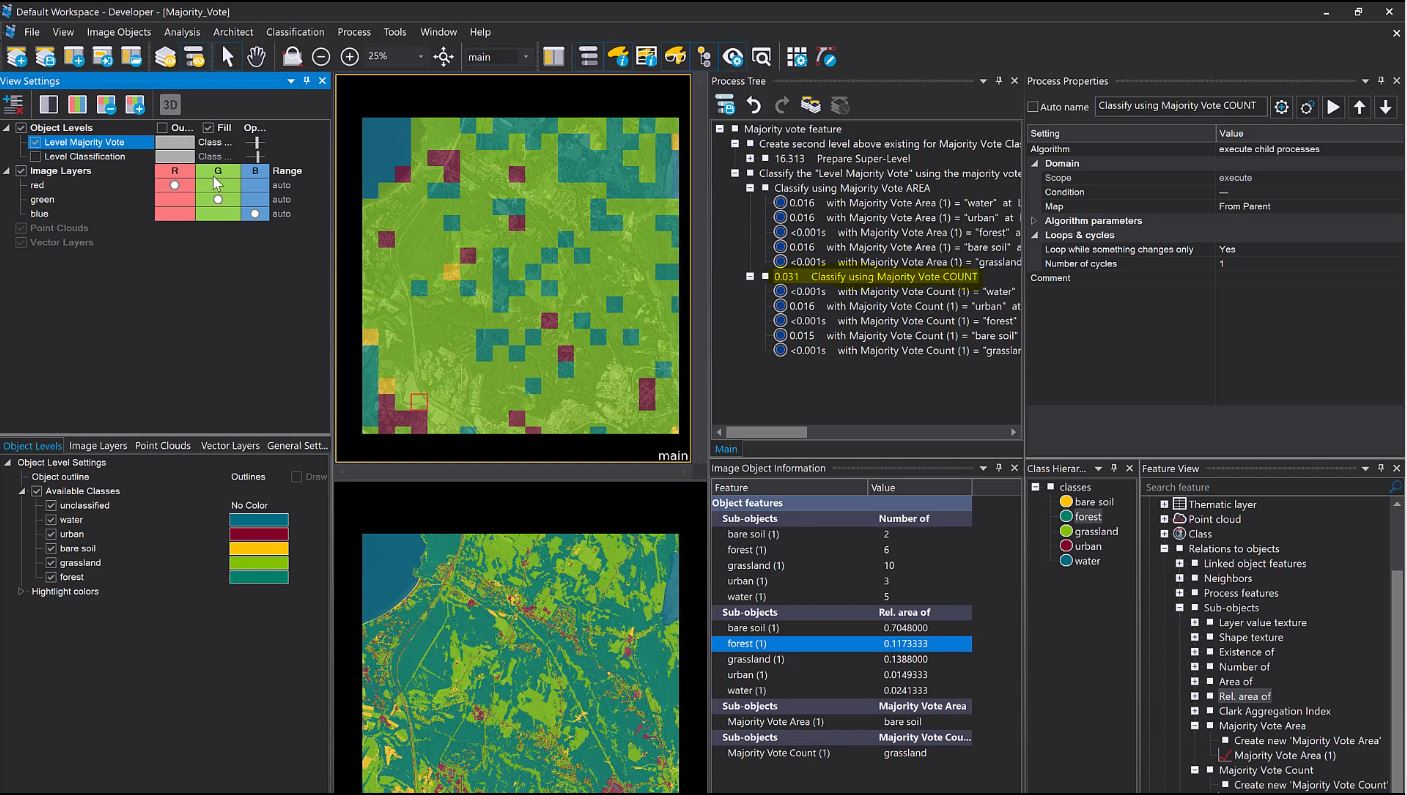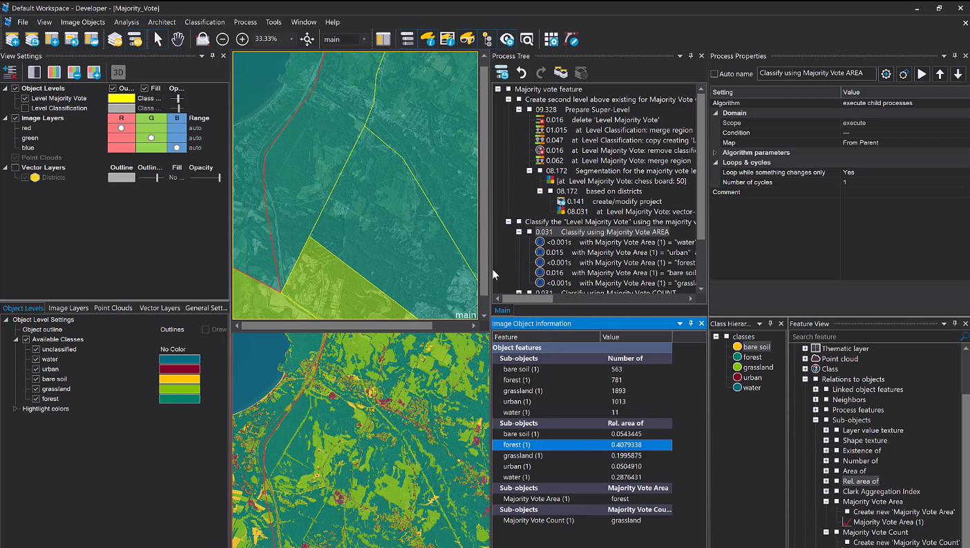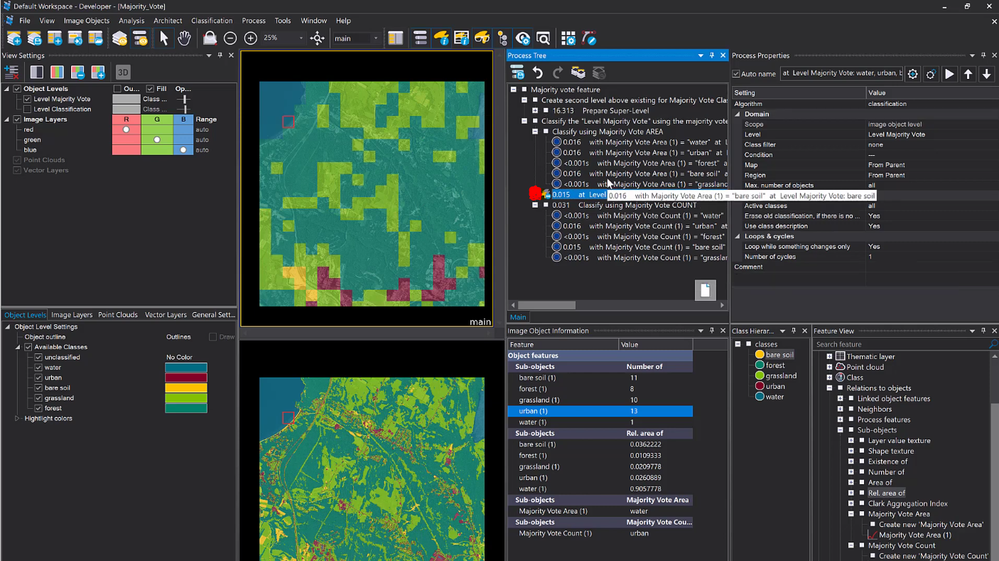 5. 同时打开影像对象信息窗口,观察多数投票特征值中土壤、森林、草地、城镇、水体5大因子的变化。以草地因子为例:多数投票的父层级显示类别为草地类型,子层级显示为混合类,通过对象信息框可以看到草地因子的子对象面积为5类因子中占比最大,故投票区为草地类型