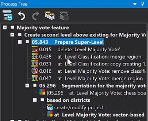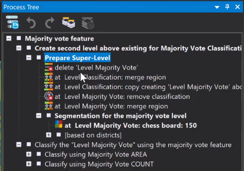 8. 为了将要投票的单个区域继续缩小,故修改规则集中棋盘分割算法对象大小,改为50,然后基于父层级(Level Majority Vote)执行下图中红框内所有规则集,结果如下