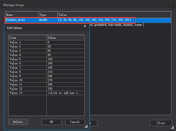 考虑到实际地物特征(道路、建筑等)的空间分布走向非不全是南北,东西走向。所以在采集样本时,可通过将用于采集样本的原始影像旋转不同角度进行样本采集,在eCognition软件中通过数组与变量即可实现,数组取值设置为按照一定步长的旋转角度,变量用于指定采集样本时具体的旋转角度。