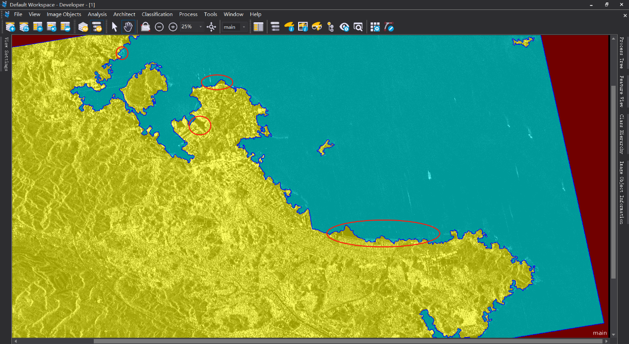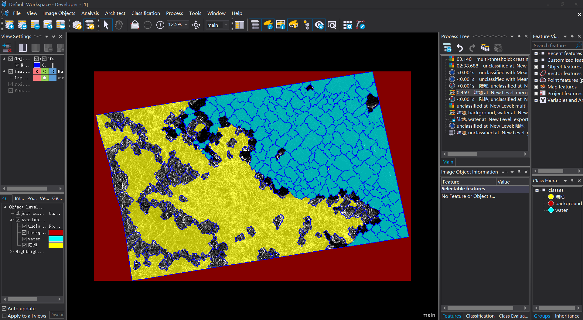 10 进行“陆地”和“水域”与“未分类”之间进行一个简单的分类去除;再将“陆地”中面积小于5000pixel的土块分到“水域”中/合并;将“水域”中面积小于5000的土块分到“陆地”中/合并