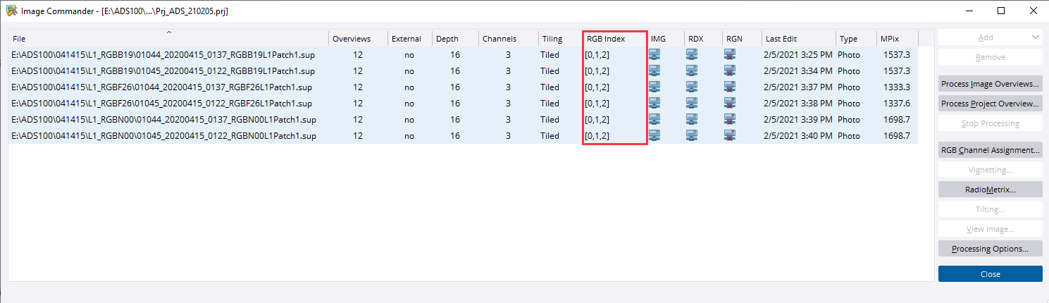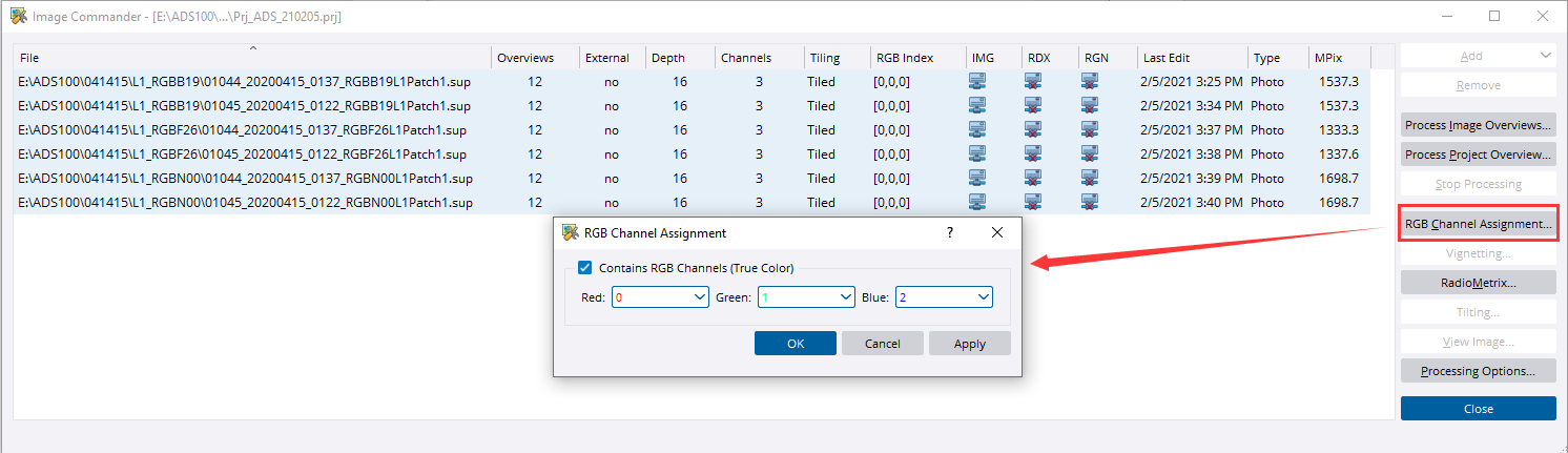 选中影像命令器中的影像文件,点击“RGB Channel Assignment”。